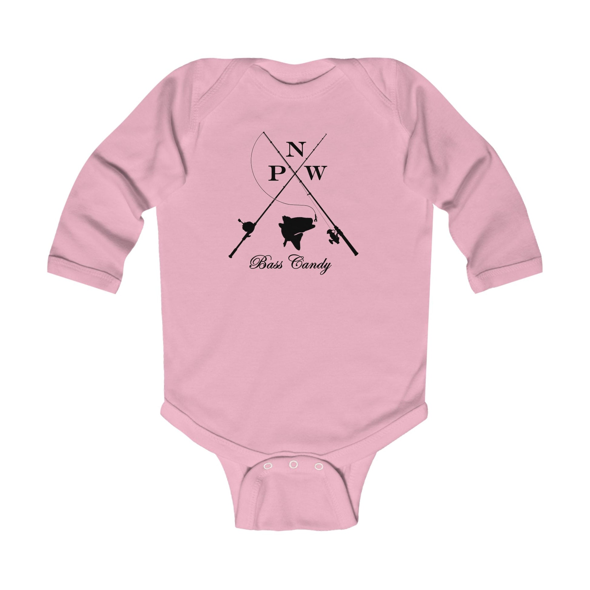 Soft, long-sleeve baby bodysuit with a minimalist Pacific Northwest fishing motif. The clean, monochrome design shows crossed fishing rods, a fish silhouette and subtle compass-style letters for N P W, evoking early mornings on the water and quiet days by the river. Lightweight cotton feels gentle against delicate skin, while the ribbed binding and three-snap closure make dressing simple and comfortable. It settles into everyday family life — from creekside strolls to cozy indoor cuddles — and carries a little outdoorsy spirit wherever your baby goes.